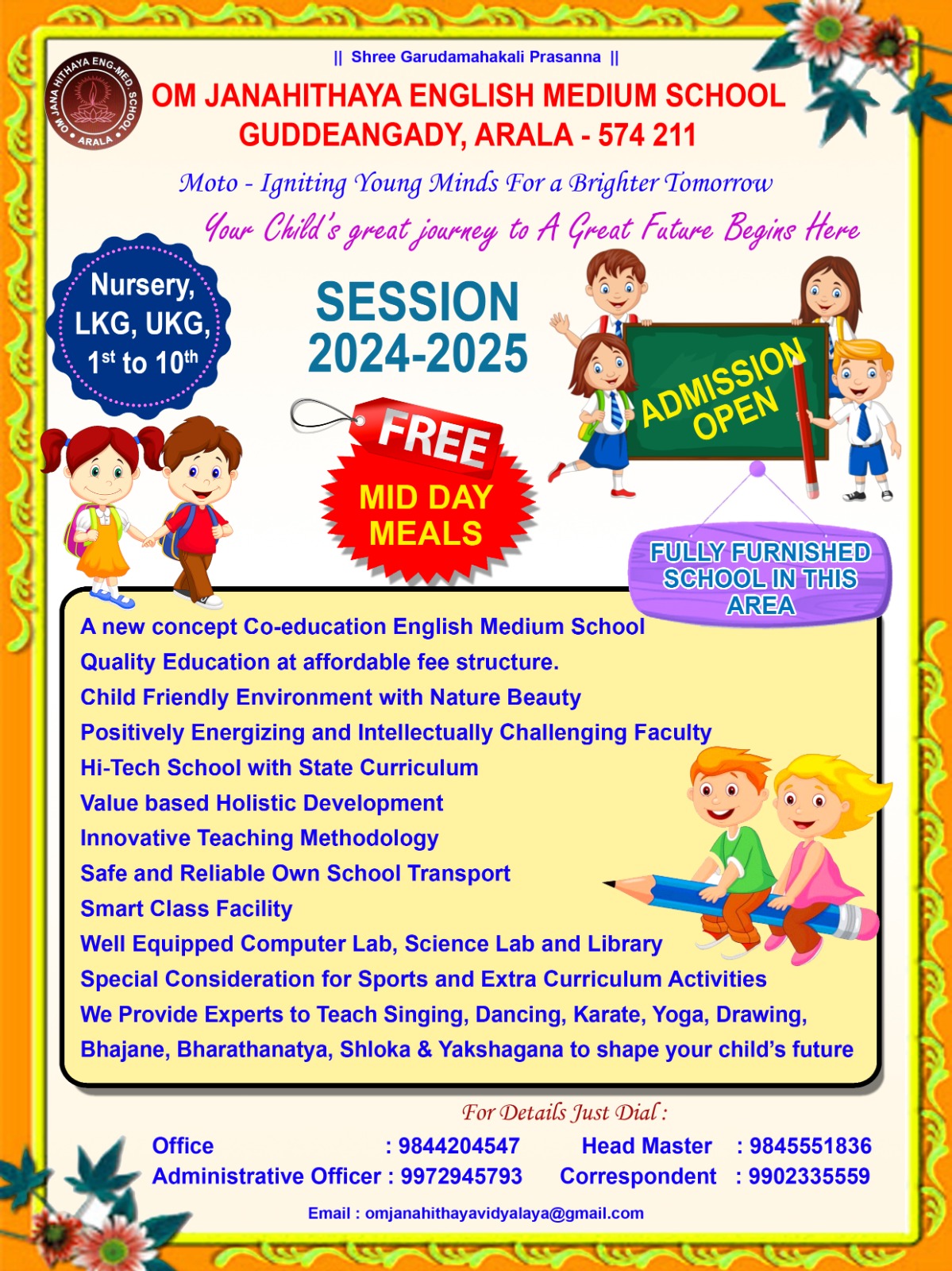 The new building of the pre-primary section of Om Janahithaya English medium School, Arala was inaugurated by the founder of the school Mr. Shantarama Shetty. Ranjan Kumar Shetty, correspondent of the school, spoke about the valuable education provided by the institution. Trustees Atitha shetty, Vanitha Shetty, Principal Mahesh Shetty were present. Teacher Nayana welcomed and Tejaswini Thanked the gathering. Teacher Shilpa Shetty introduced the teachers. Lavi Mascarehnus narrated the program.