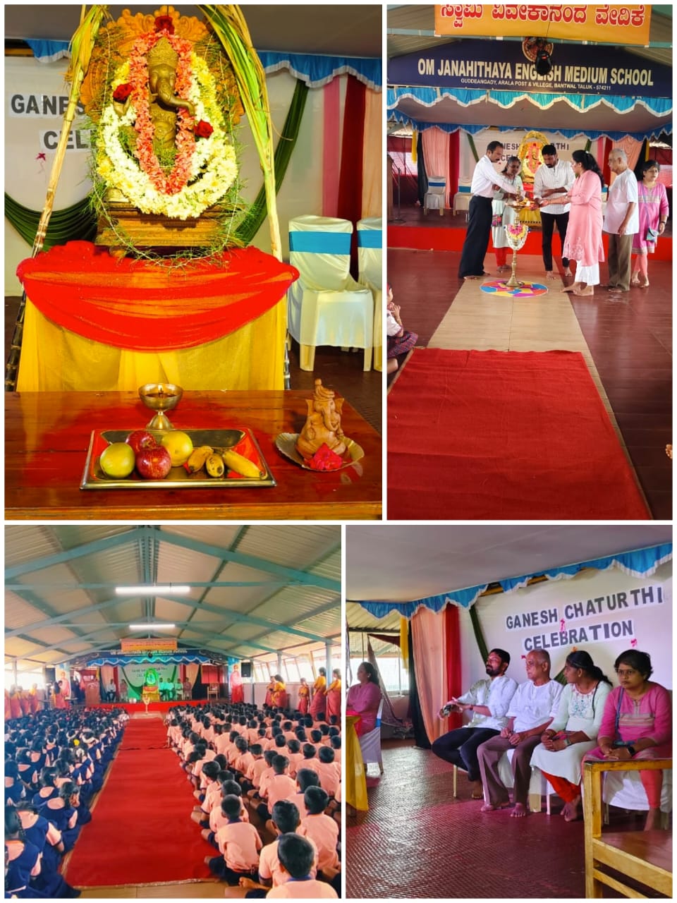 Om Janahithaya English Medium School Arala Ganesh Chaturthi celebration was held on 09-09-2024 . School founder Shantharama Shetty inaugurated the program by lighting the lamp Correspondent Ranjan Kumar Shetty ,Trustees Atitha shetty and Vanitha shetty, Administrative Officer Raksha Shetty, Head Master Mahesh Shetty were present .Bharatnatyam ,Kunitha Bhajan was performed by the students.Vidisha of class 7 explained the importance of Chauthi. Kushi Rai of class 7 welcomed and Pavani of class 7 gave felicitations to the dignitaries.Shravanth of class 4th prayed and Sindhu of class 9 narrated the program. Teacher Vidisha Shetty was the program compositor. All the teachers and students were present in the program.
