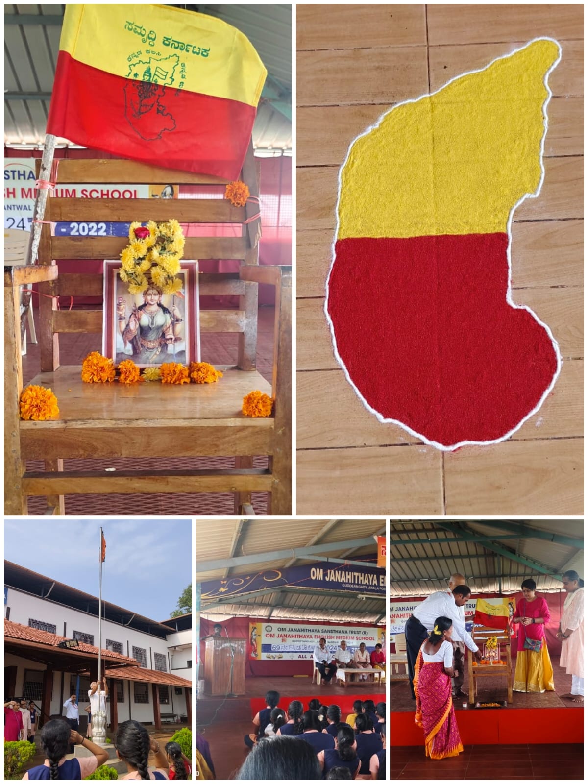 69th Kannada Rajyotsava was celebrated here at Om Janahithaya English Medium School, Arala. Shantarama Shetty, founder of the school, hoisted the flag. The Guests ShanthaRama Shetty, Athitha Shetty, Vanitha Shetty (Trustees), Head Master Mahesh Shetty offered flowers to mother Bhuvaneshwari.Teacher Veena gave a speech about the Rajyotsava. A dance, group song was sung by the students. Class 10 student Trisha prayed and 7th class student Dikshith welcomed the gathering. The program was Narrated by Pranvi P Alva. Teachers Revathi and Shruthi coordinated the program. Students and Teachers were present at the occasion.